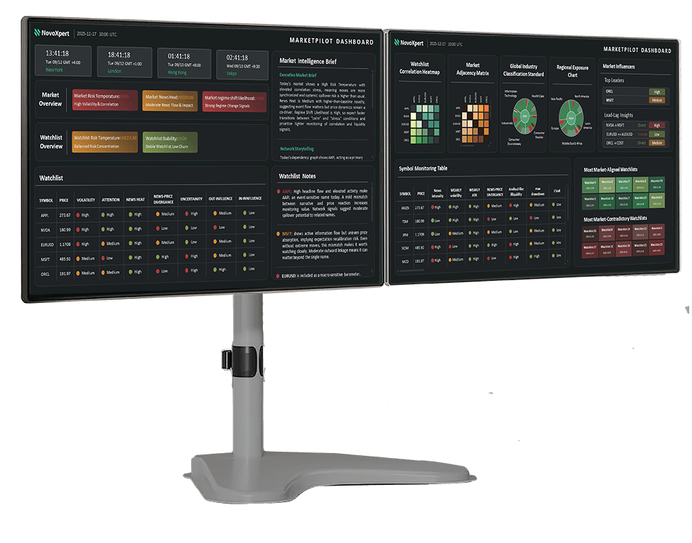The NovoXpert Dashboard provides a live, structured view of market conditions by combining price behavior, news flow, network dependencies, and data-quality checks in one unified interface—built for monitoring and risk awareness.